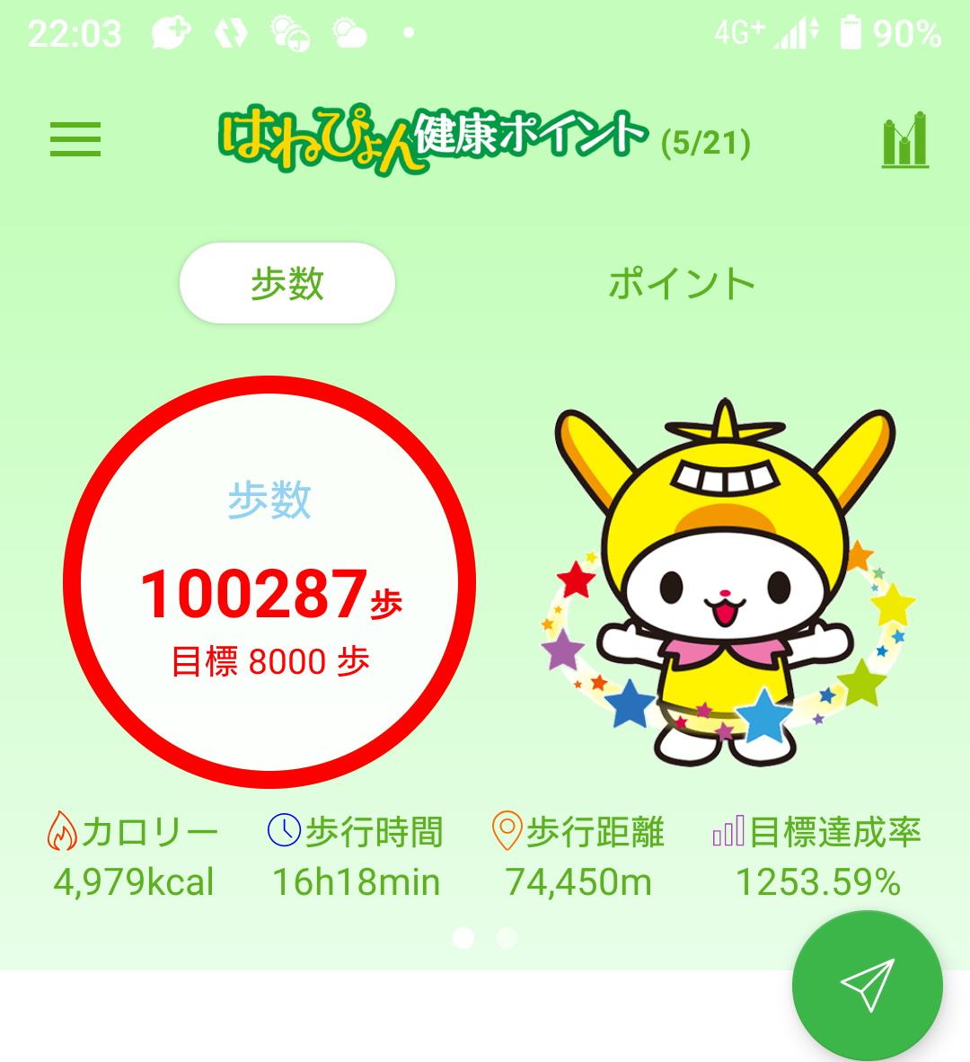 歩数は144000歩、実歩量は108kmでした。あと歩いてた時間は1299分、21時間半か。