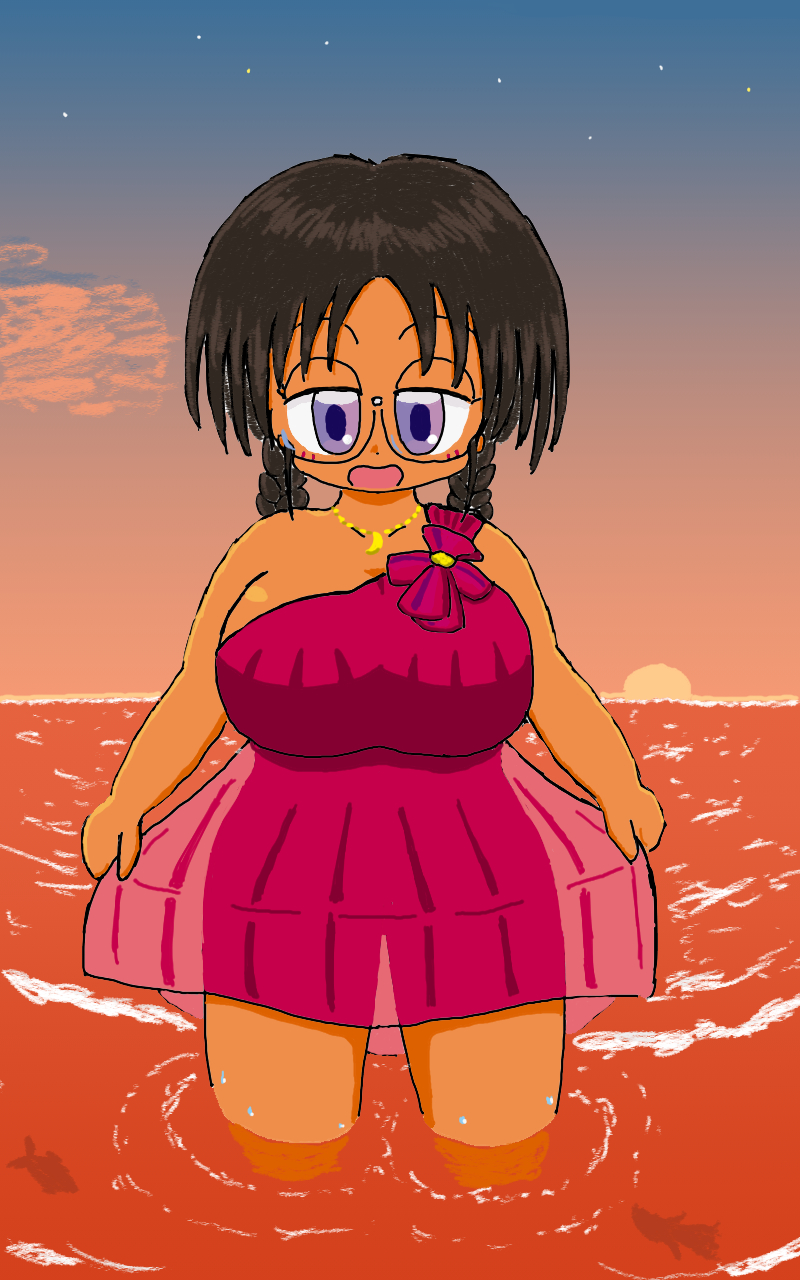 「夏も夕暮れ」 夕日を背に浅瀬にて足を浸らせるの図。