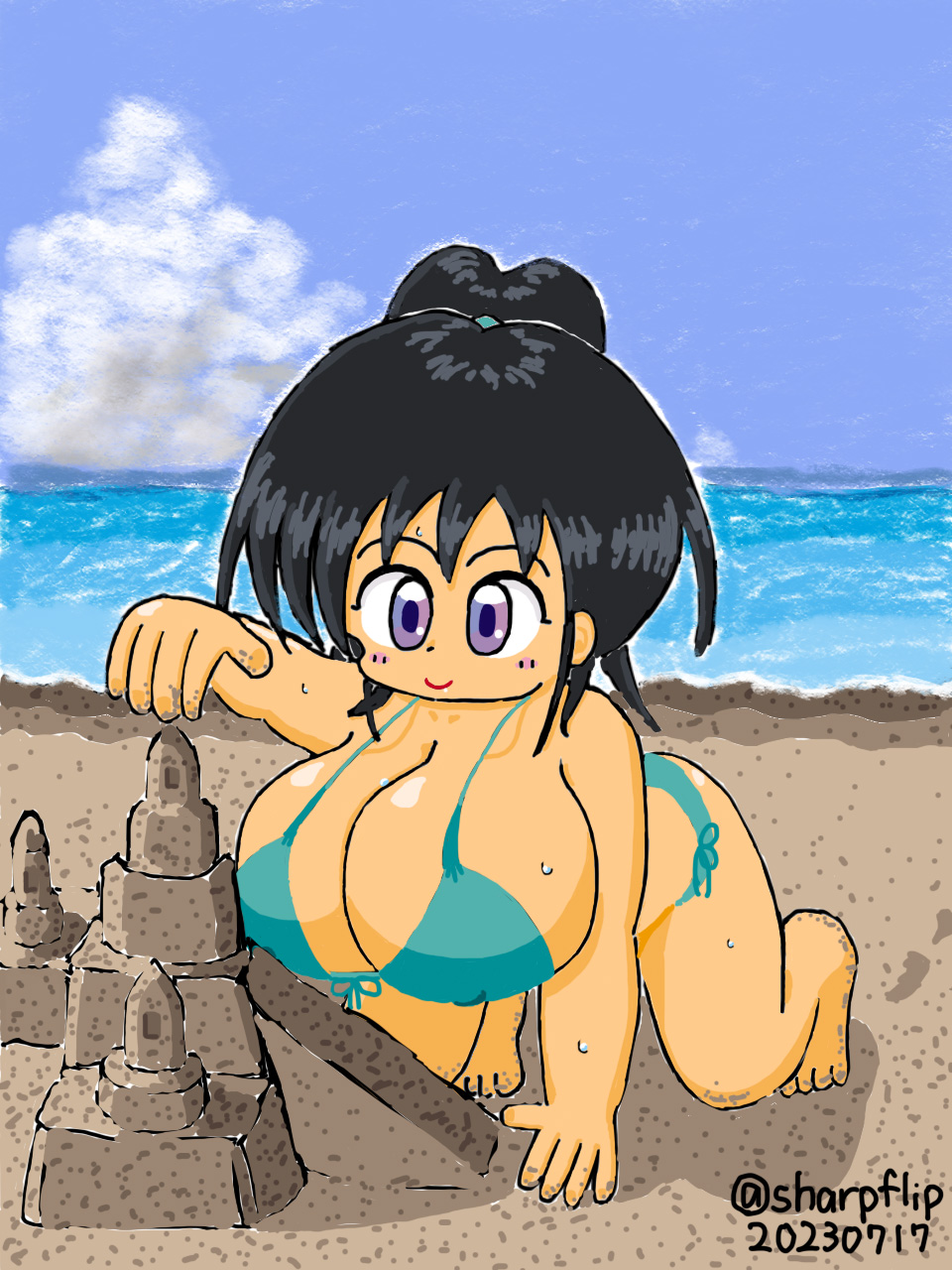 その17日の描画。砂浜と砂の城。